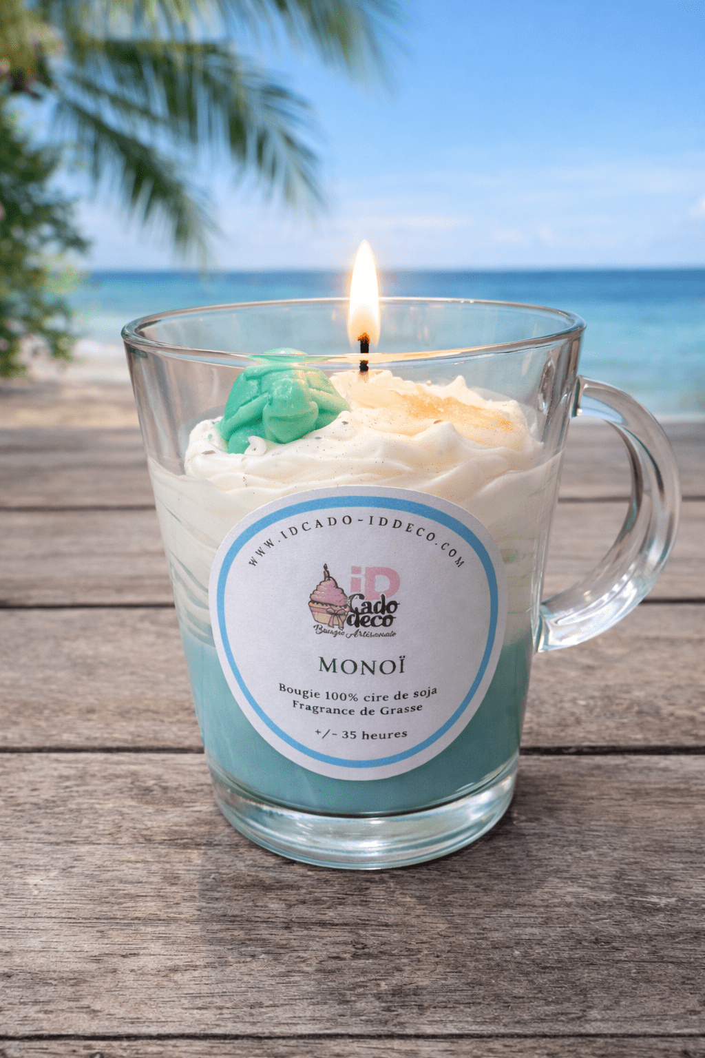 Cette bougie artisanale diffuse un parfum exotique et envoûtant de monoï, mélangeant des notes florales et sucrées qui évoquent la chaleur du soleil et la douceur des îles tropicales.